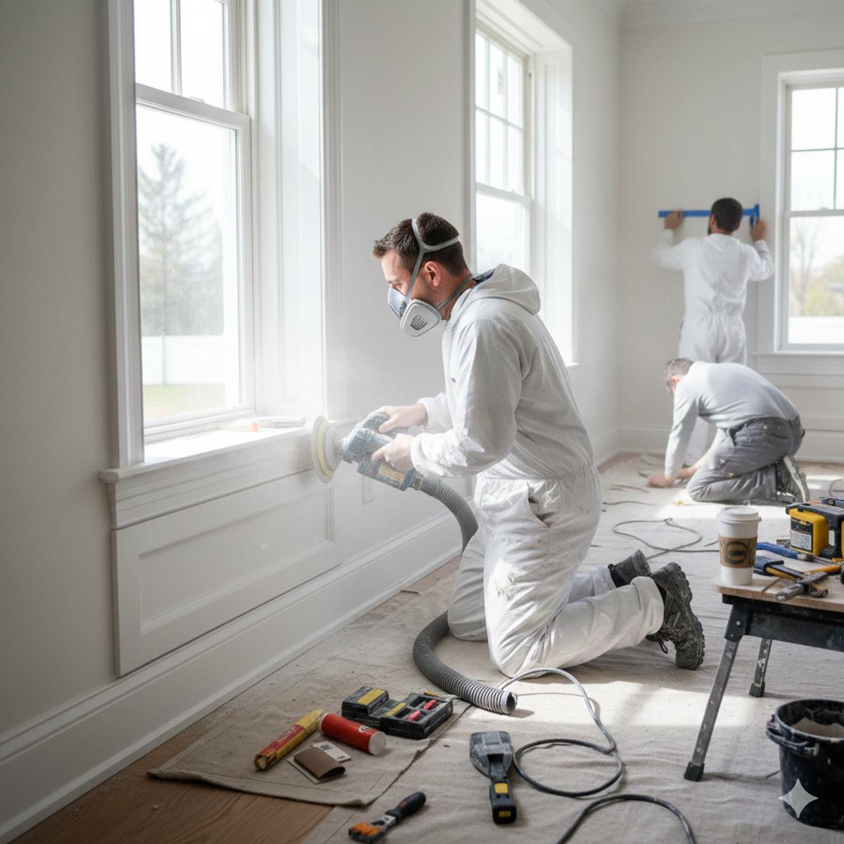 - Sanding all patched areas and rough surfaces to a smooth, even finish